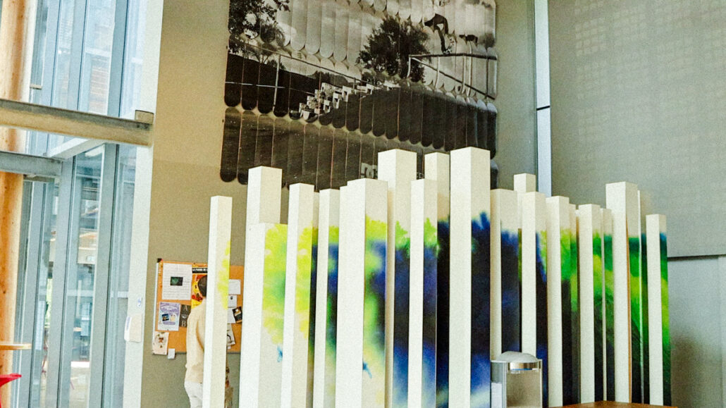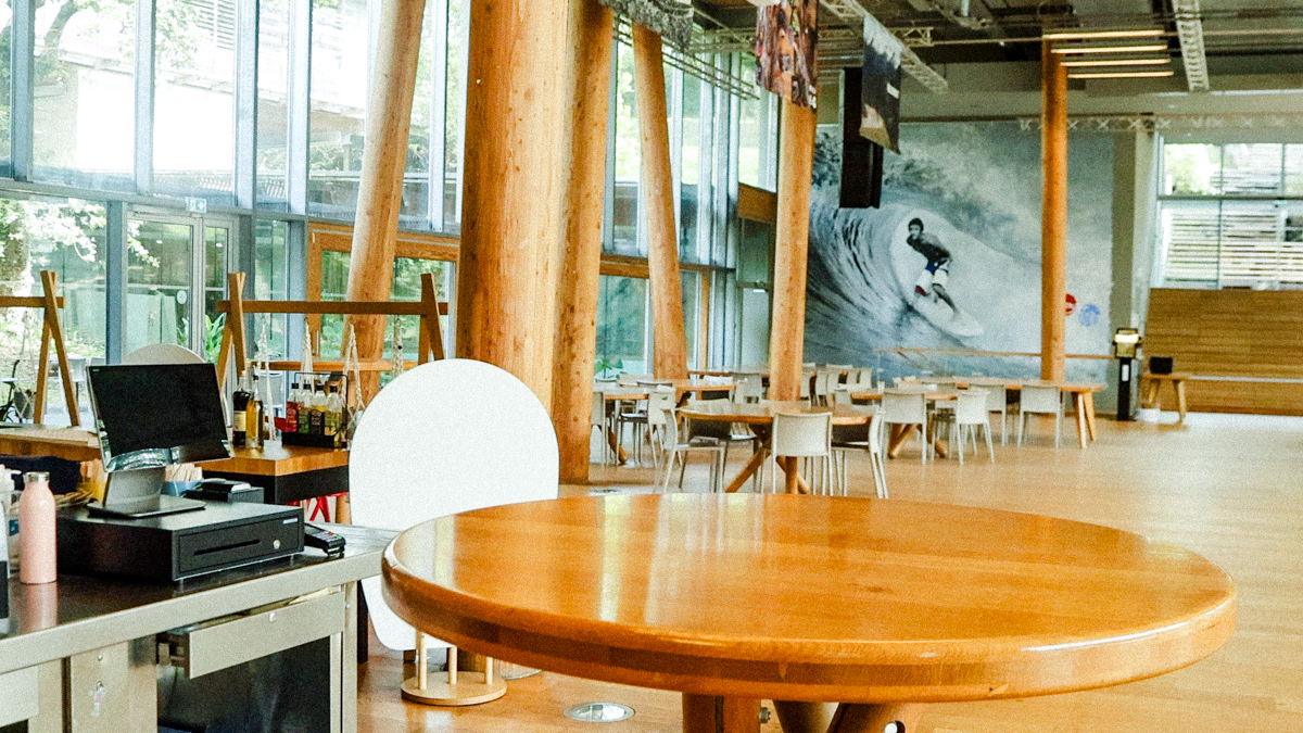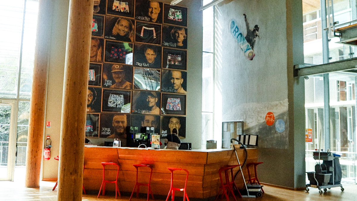 社員食堂にはカウンターの壁にQUIKSILVERを代表するトップライダーたちのポートレイトが巨大展示。