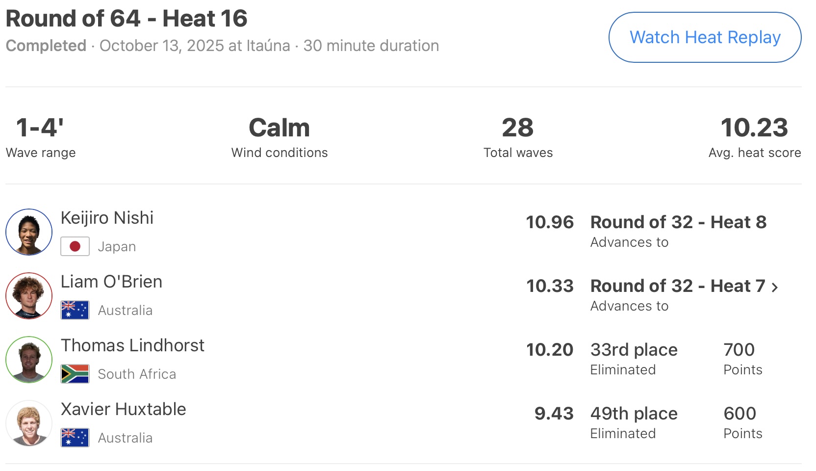 注目の日本代表選手たちの活躍は、ヒート終了のホーンが鳴り響く中で掴んだ最後の波で大逆転を果たした西慶司郎がMENSラウンドオブ64のヒート16を1位で勝ち上がり、WOMENSラウンドオブ32のヒート3では池田美来が8.00ptのエクセレントスコアと7.17ptをバックアップにまとめトータルスコア15.17ptを叩き出して1位でラウンドアップ!