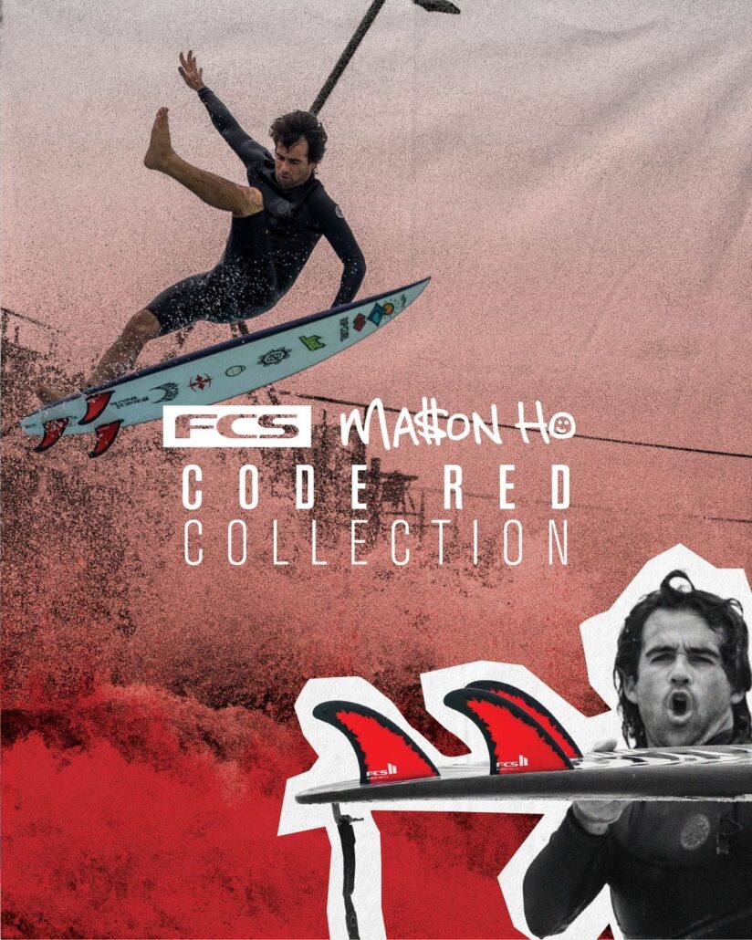 MASON HOこだわりの新開発のフィン、デッキグリップ、リーシュ、ボードカバーを集めたファイアー仕上げのデザインの”CODE RED” セレクションが日本で販売がスタートとなった。