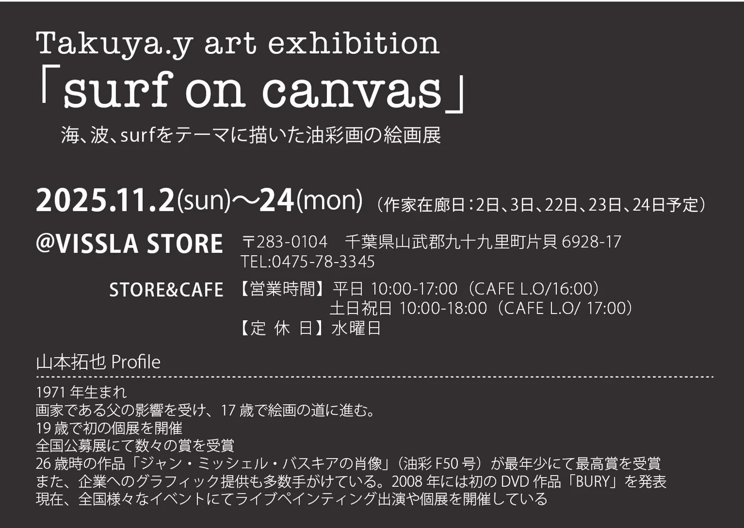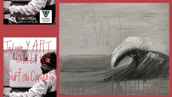 ショートボードやロングボードよりもその目線の低さから波を近くに感じることができるニーボードを愛するサーファー×油彩画アーティストのTAKUYA.Y氏が11/2(日)〜11/24(月)までの期間限定で、千葉の片貝にあるVISSLA STOREにて開催されることが決定となった!