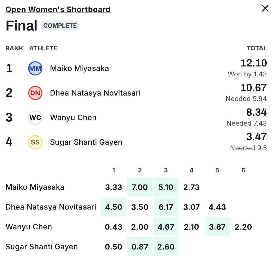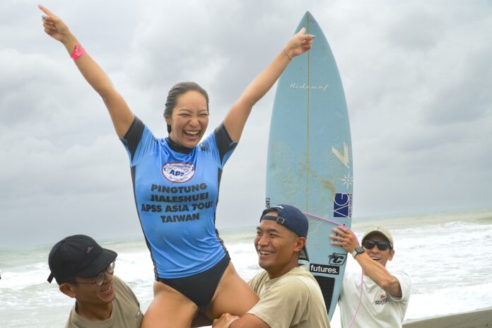 中国・舟山で開催されたAPSS東沙オープン・オブ・サーフィンで優勝したばかりであり、現在APSSのWOMENSショートボード・ランキングの1位のインドネシア代表選手Dhea Natasya Novitasariを抑えての見事な優勝となった。