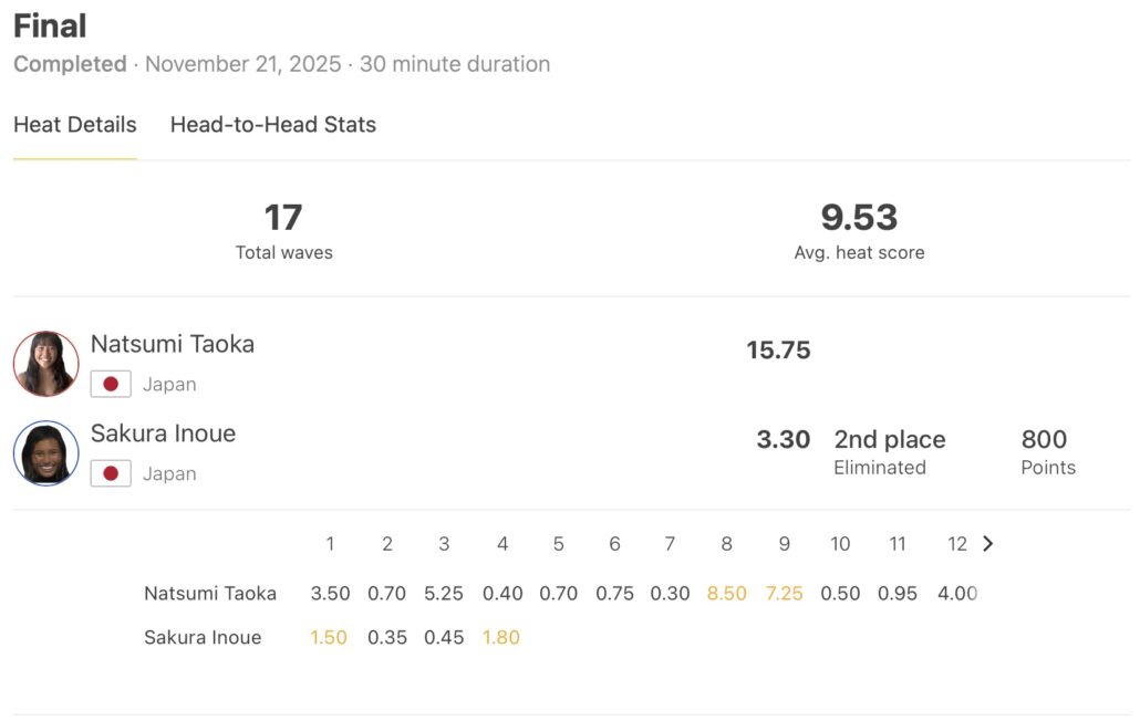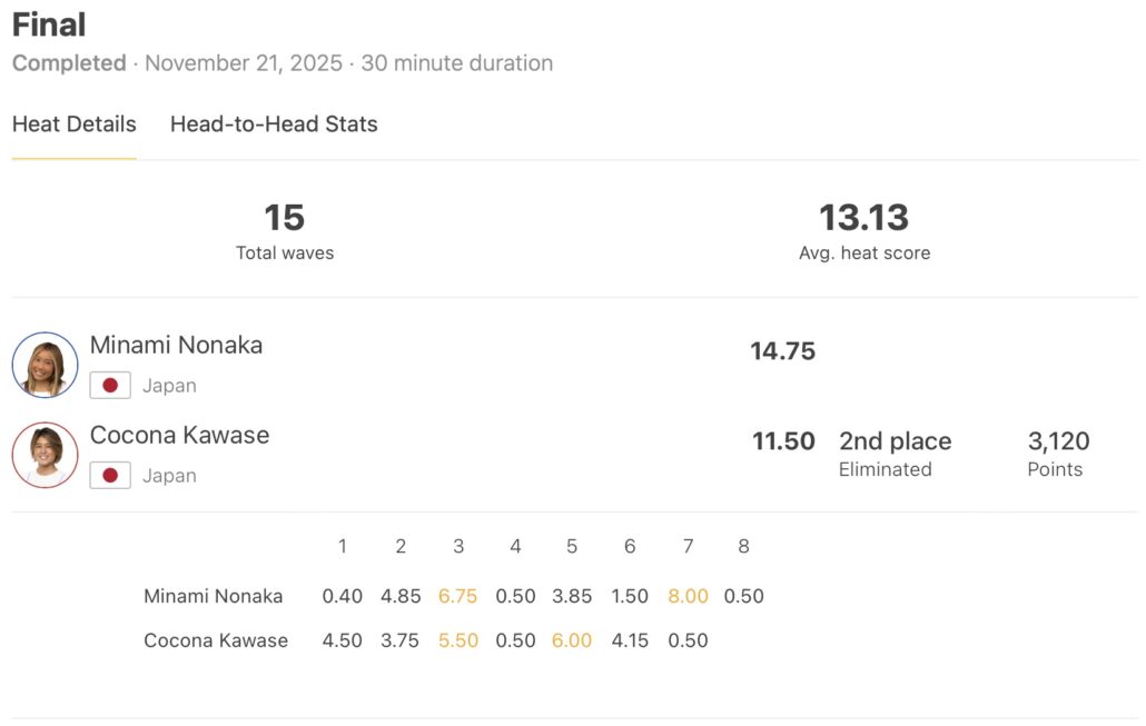 決勝で野中美波がマークした2つのハイスコアは、いずれも鋭いバックサイド・アタックによるもので、パリオリンピック日本代表選手の松田詩野を破ったセミファイナルでも素晴らしいバックサイド・サーフィンを披露した。
