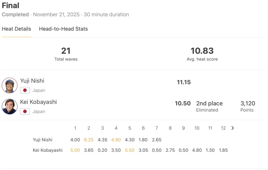 ファイナルでは今シーズン5度目のQSファイナル進出となった小林桂を相手にリードを保ち、合計12本の波を掴んだ小林桂に逆転する隙を与えなかった。