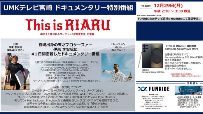 宮崎が生んだ天才プロサーファー伊東李安琉の41日間に密着したドキュメンタリー番組”This is RIARU”が、来たる12/29(月)テレビ宮崎にてオンエアされることが決定となった!
