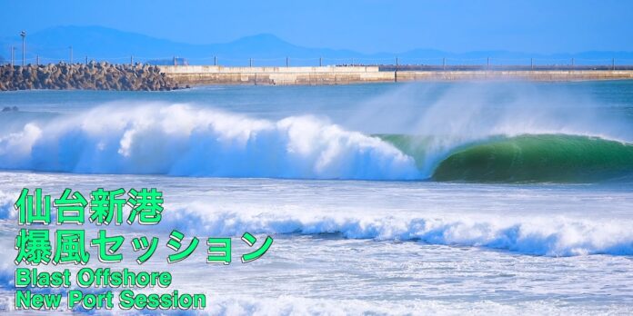 西高東低の冬型が強まったことにより冷たい爆風オフショアが吹き荒れ、ダブル前後のチューブが姿を現した2025年年末の仙台新港。