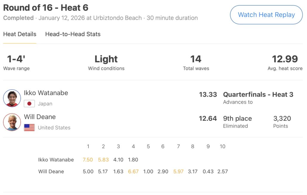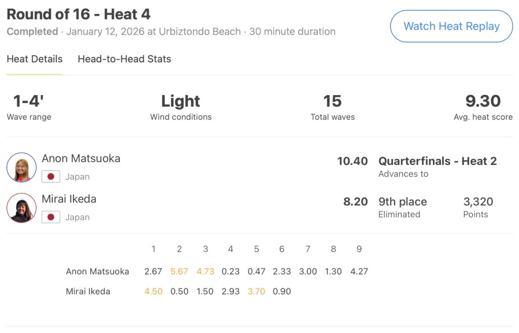 さらに組み合わせの悪さによりオープニングラウンドに引き続きラウンドオブ16のヒート4でも再戦することとなった同じ日本代表の松岡亜音に敗退となった池田美来が今大会を9位でフィニッシュすることとなった。