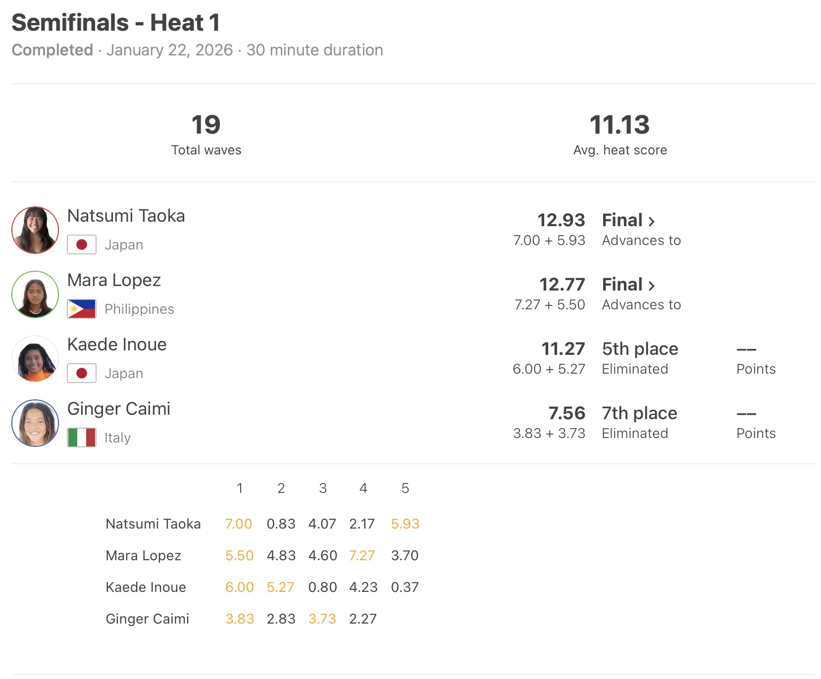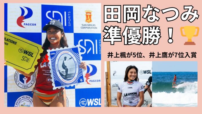 準優勝の田岡なつみを筆頭に、井上楓と井上鷹が上位入賞を果たし、日本代表選手たちの活躍が目立った今回のQS10000″La Union International Pro”。