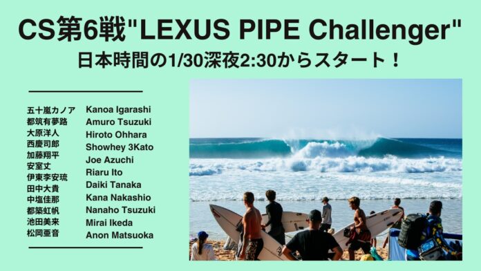 ハワイのパイプラインを舞台に開催されるCS第6戦”LEXUS PIPE Challenger”が日本時間の1/30深夜2:30からコンテスト期間に突入!