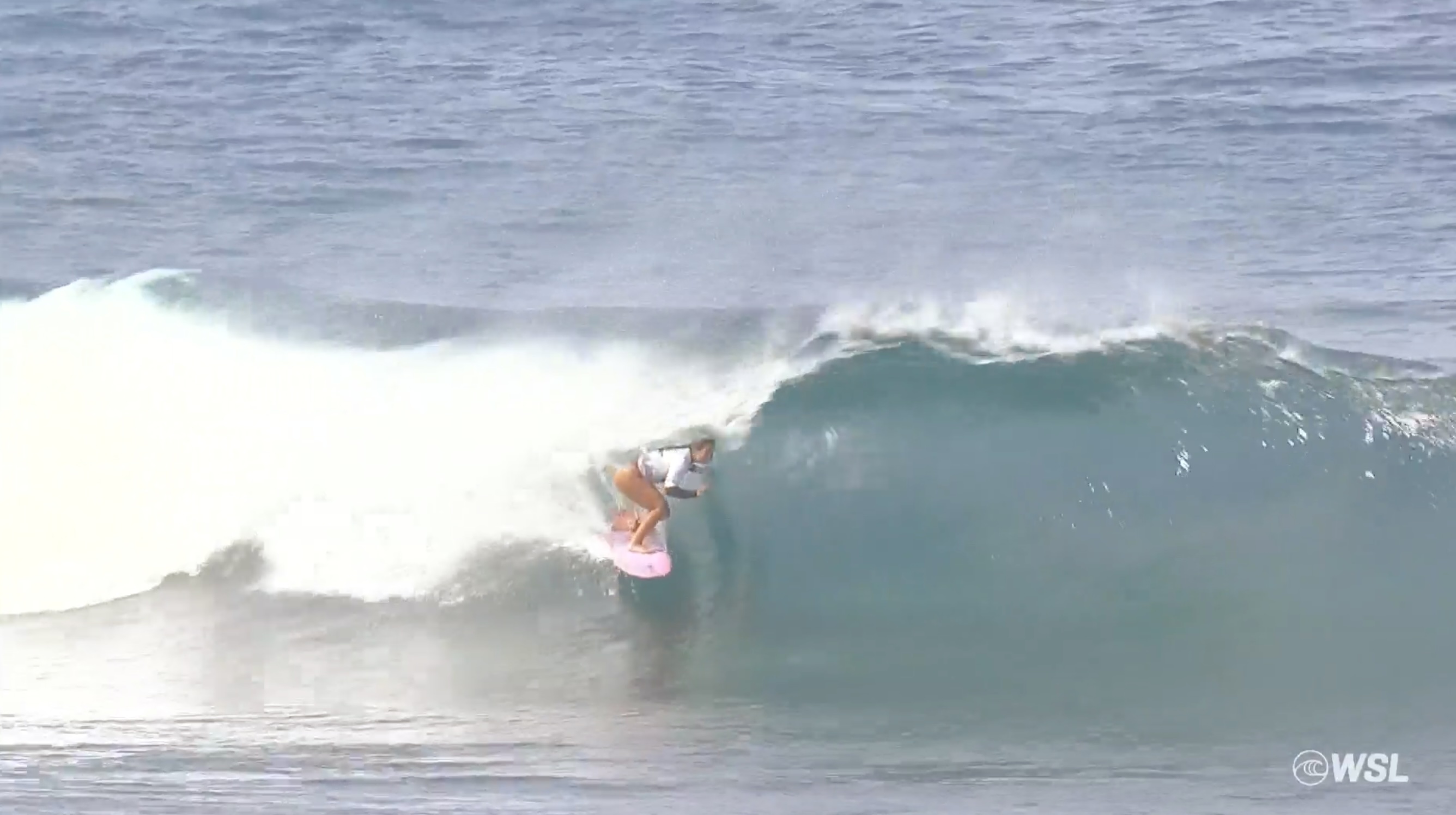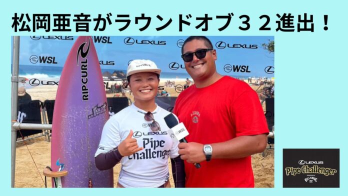 注目の日本人選手の活躍は、ヒート7に出場した松岡亜音がパイプの波でチューブをメイクしてトータルスコア11.00ptをマークし、見事1位でラウンドオブ32へ進出!