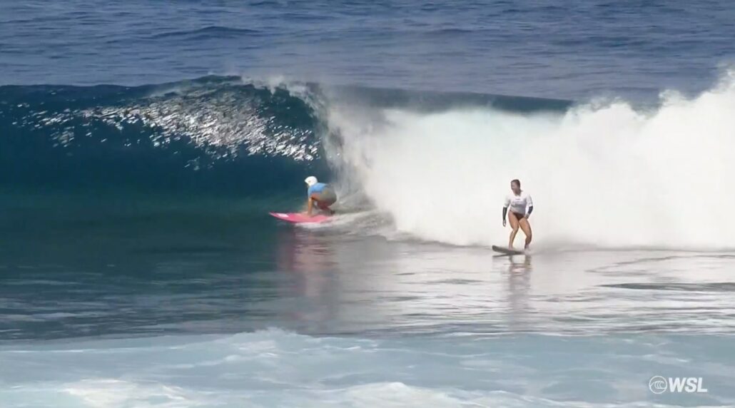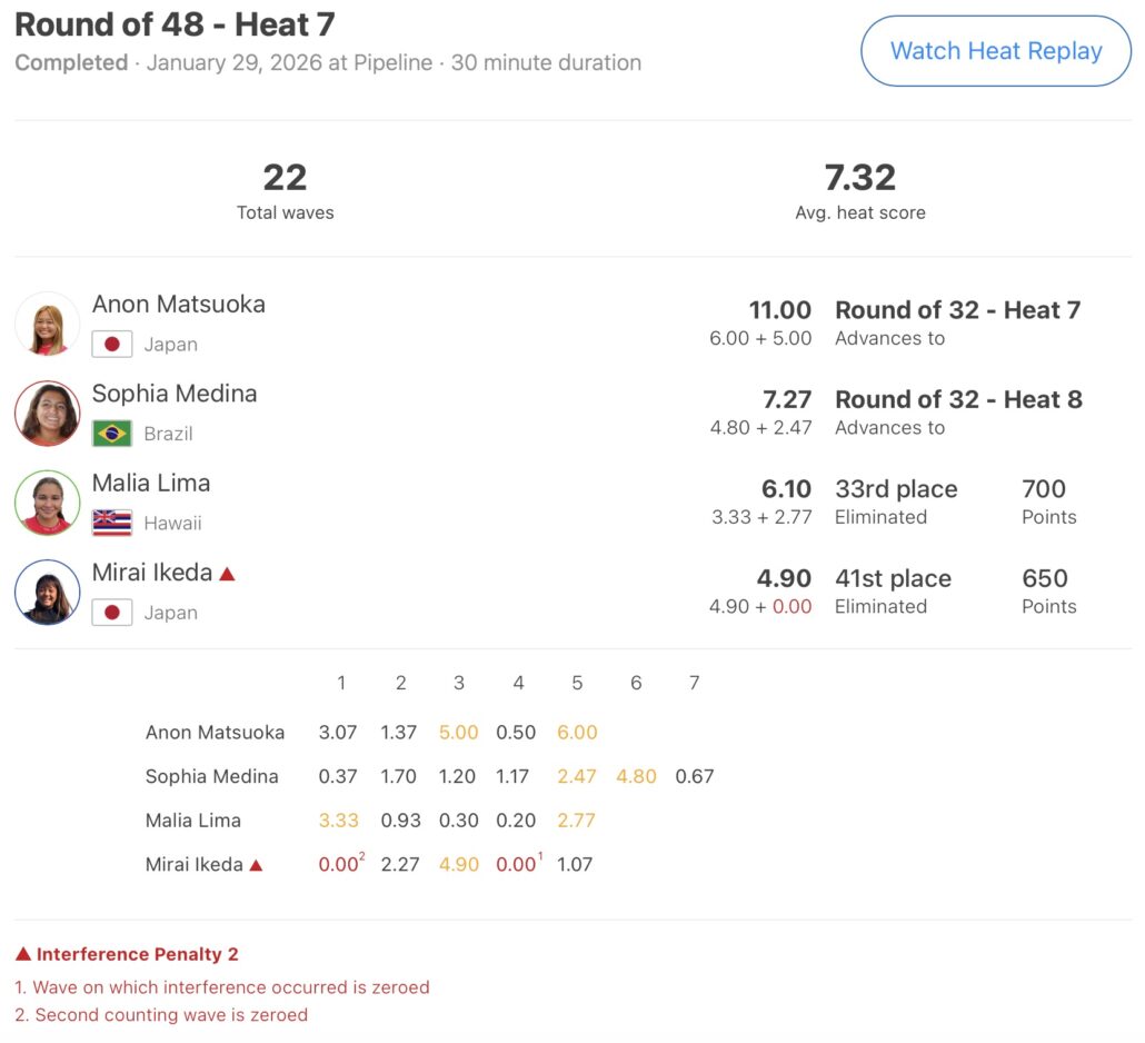 その一方で、松岡亜音と同じヒートに組み込まれていた池田美来が、バックドアの波を掴んだ際に松岡亜音に対して痛恨のインターフェアを犯してしまい、この波でチューブをメイクして4.90ptをスコアしたものの、ベスト1ウェイブで戦わなくてはいけない状況となってしまい、惜しくもここで敗退となってしまった。