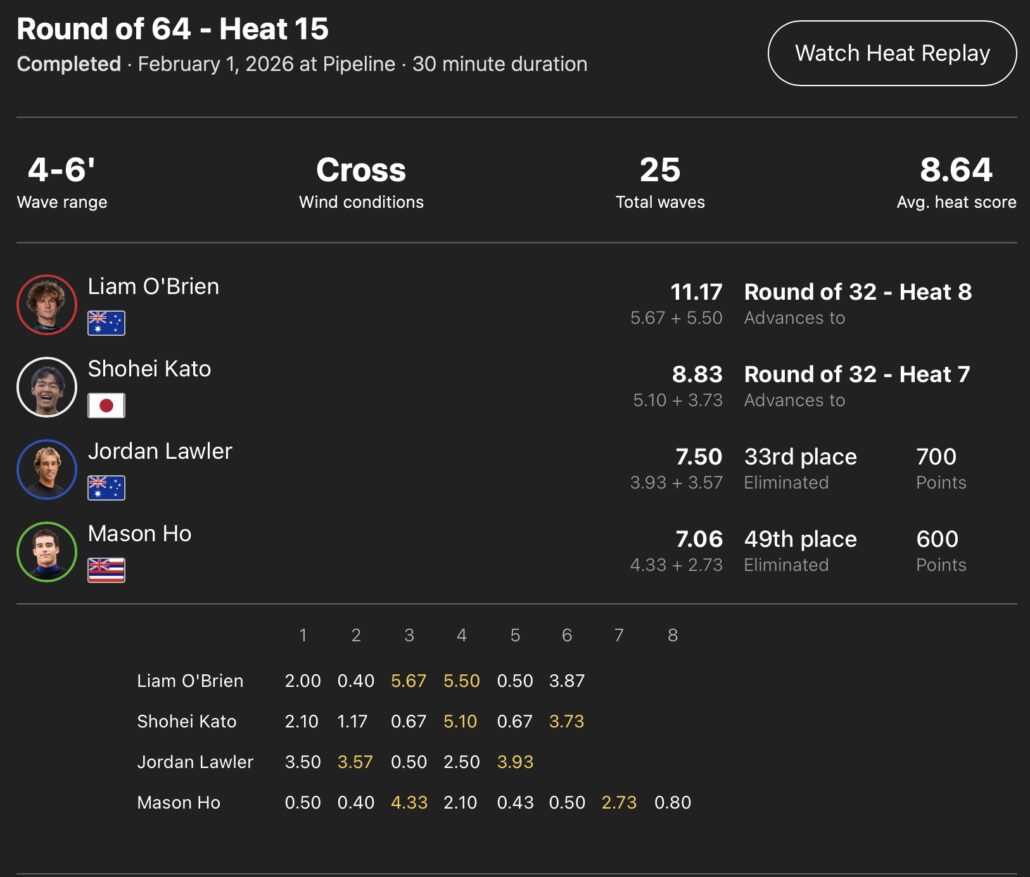 ハワイのパイプラインで開催中のCS第6戦”LEXUS PIPE Challenger”は、セットで6-8ftのグッドコンディションから後半にかけてサイドオンショアのジャンクコンディションに変化した日本時間の2/2(月)、現地時間の2/1(日)にコンテストDAY3が行なわれ、MENSラウンドオブ64の全ヒートを消化。