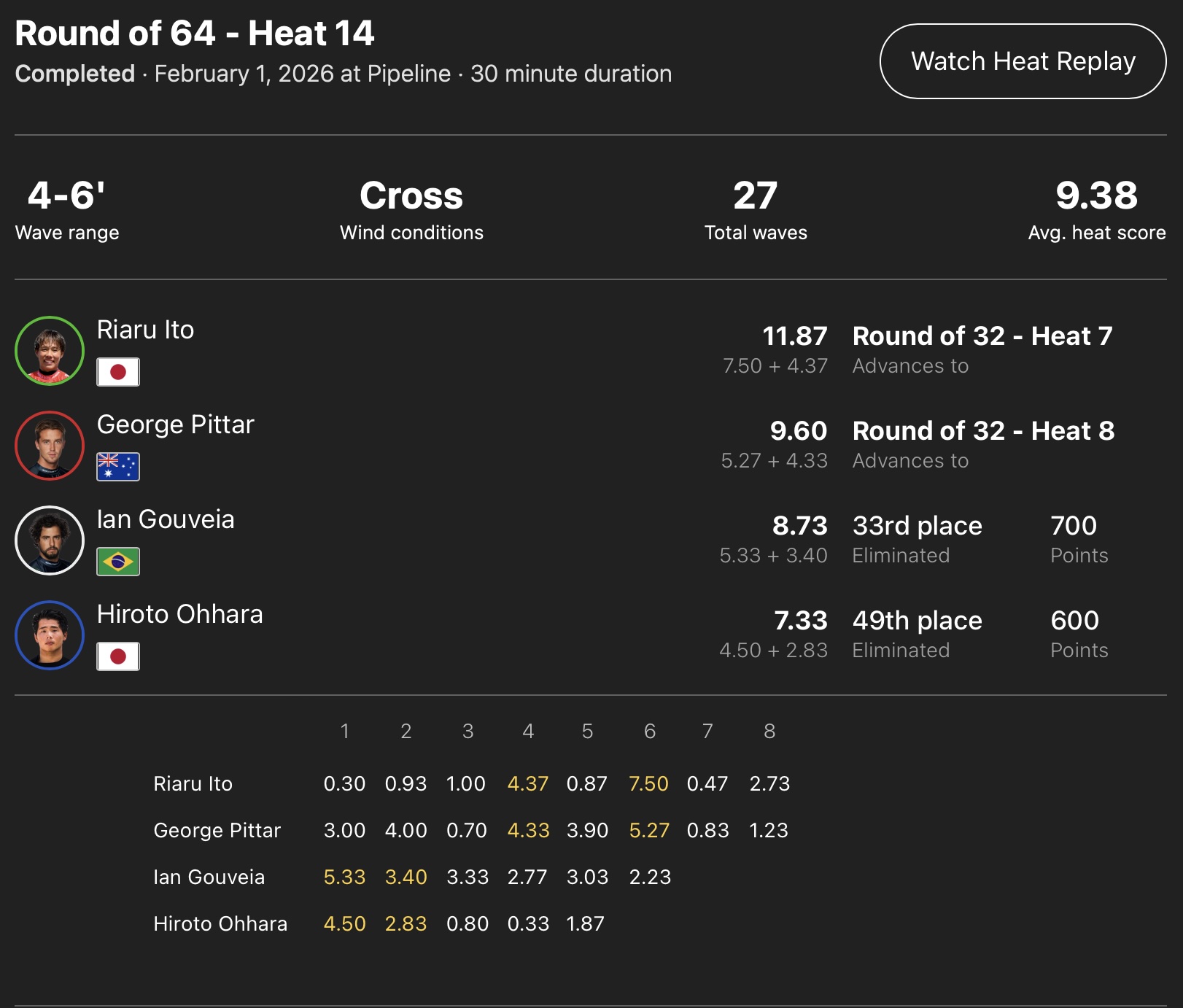 午後の風がチューブになる波を激減させたことにより現在CSランキング1位のEli Hannemanや、日本世界に誇るサーフスター五十嵐カノアがまさかの敗退となる番狂わせが巻き起こった中、注目の日本人選手の活躍は、ヒート14で神懸買ったパイプのチューブを引き寄せた伊東李安琉が見事なバレルをメイクした後にビッグ・リエントリーでフィニッシュするライディングで7.50ptを叩き出し、元CTサーファーのGeorge PitterとIan Gouveia、さらに大原洋人を抑えて見事1位でラウンドアップを果たした!