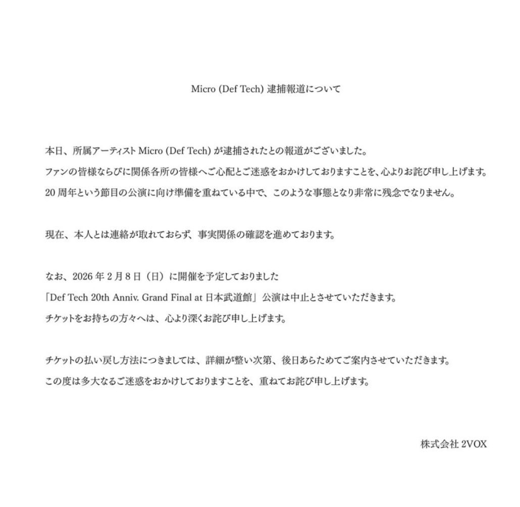 これを受け、Def Tech公式ホームページや公式SNS、所属事務所によって2/8(日)に日本武道館で予定されていた20周年記念ライブは中止することに決定したことを公表した。