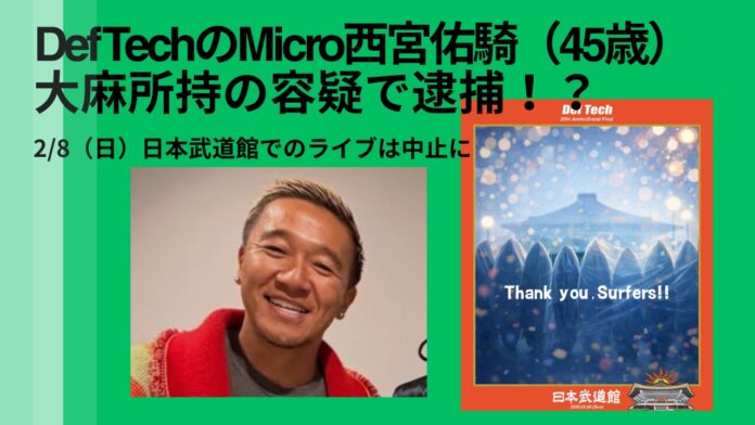 2/8(日)に日本武道館での20周年記念ライブを控えていたDefTechのMicroとして活躍する西宮佑騎(45歳)が大麻所持の容疑で2/3(火)に逮捕された。