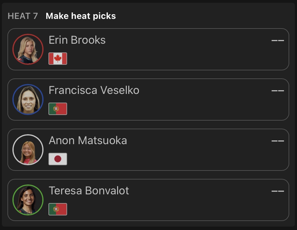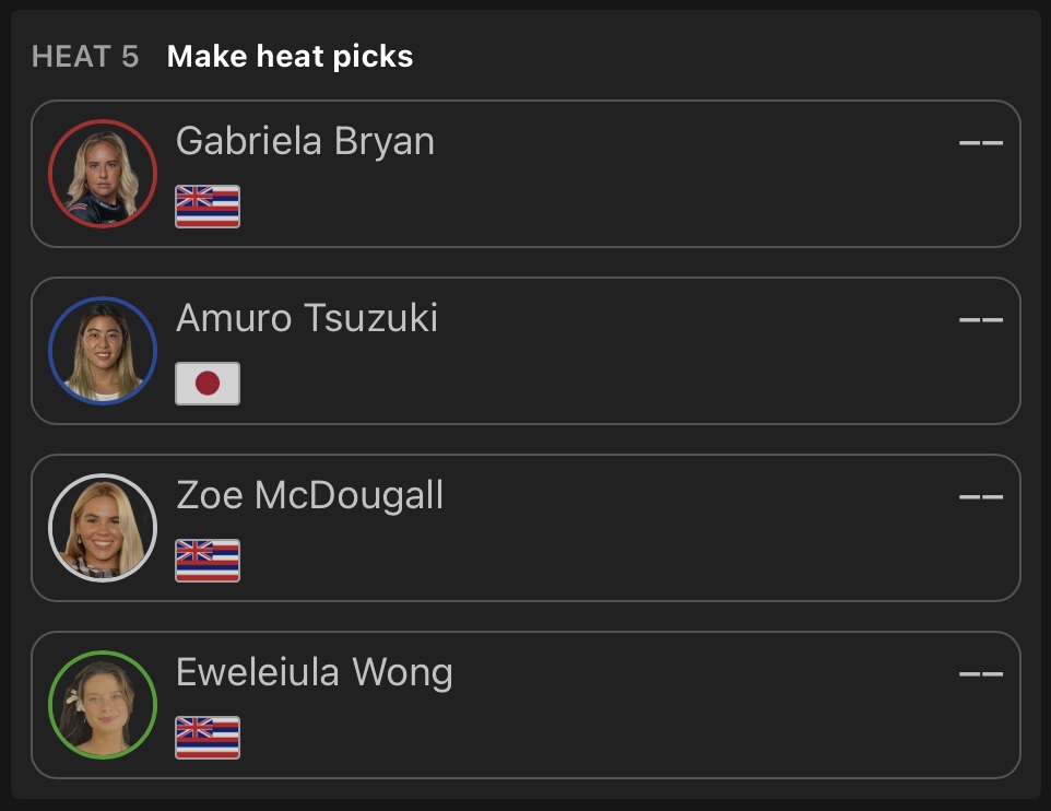 都筑有夢路はヒート5でGabriela Bryan、Zoe McDougall、Eweleiula Wangといった地元ハワイアンの強豪3名と対戦予定となっており、松岡亜音はヒート7でErin Brooks、Francisca Veselko、Teresa Bonvalotといった世界のトップたちと対戦することとなっている。