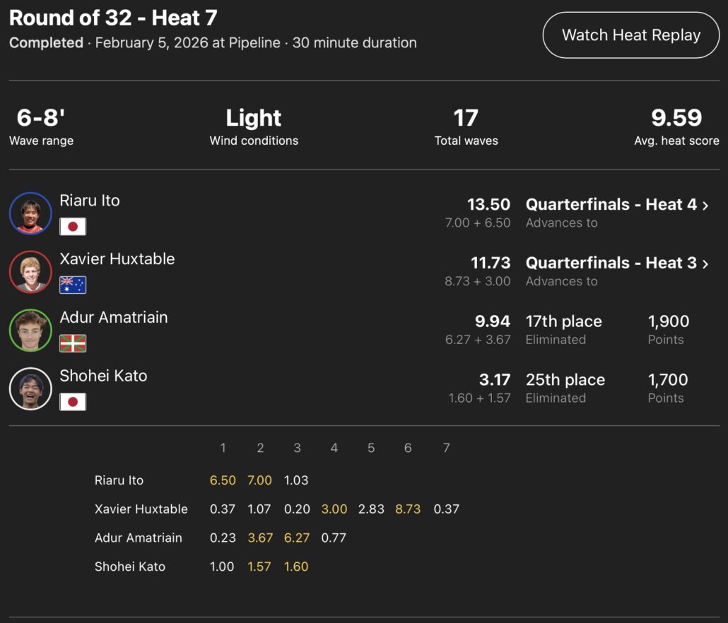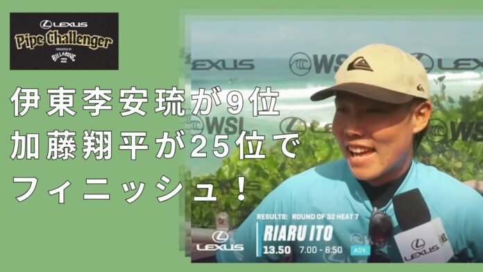 その一方で伊東李安琉とラウンドオブ32のヒート7で対戦し、パイプ、バックドアに狂気のチャージを魅せながらも惜しくもここで4位敗退となってしまった加藤翔平は25位という結果となった。