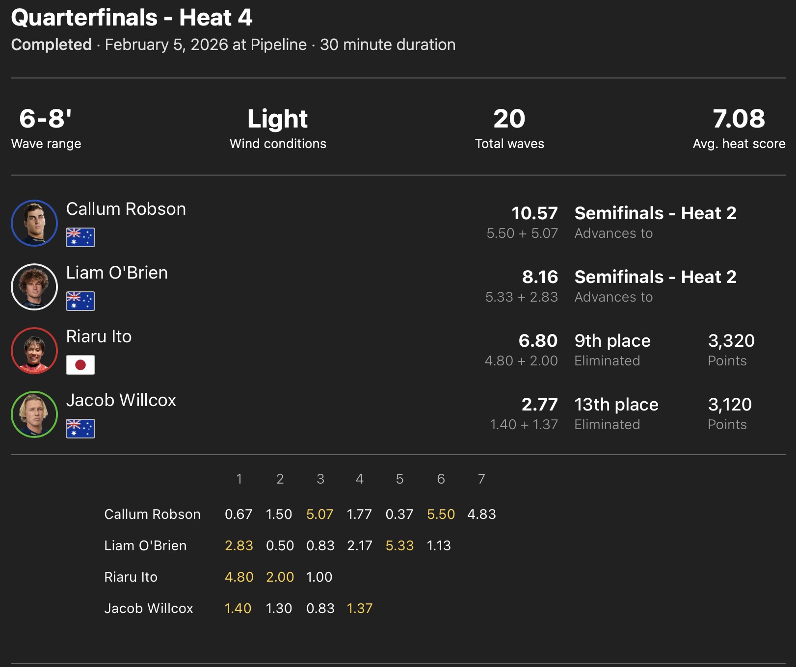 迎えたクォーターファイナルでも1本目からパイプの波を掴んで4.80ptをスコアして順調なスタートを切ったかのように見えたが、しかしその後にいい波を掴むことができず、惜しくもここで敗退となってしまい、今大会を9位でフィニッシュすることとなった。