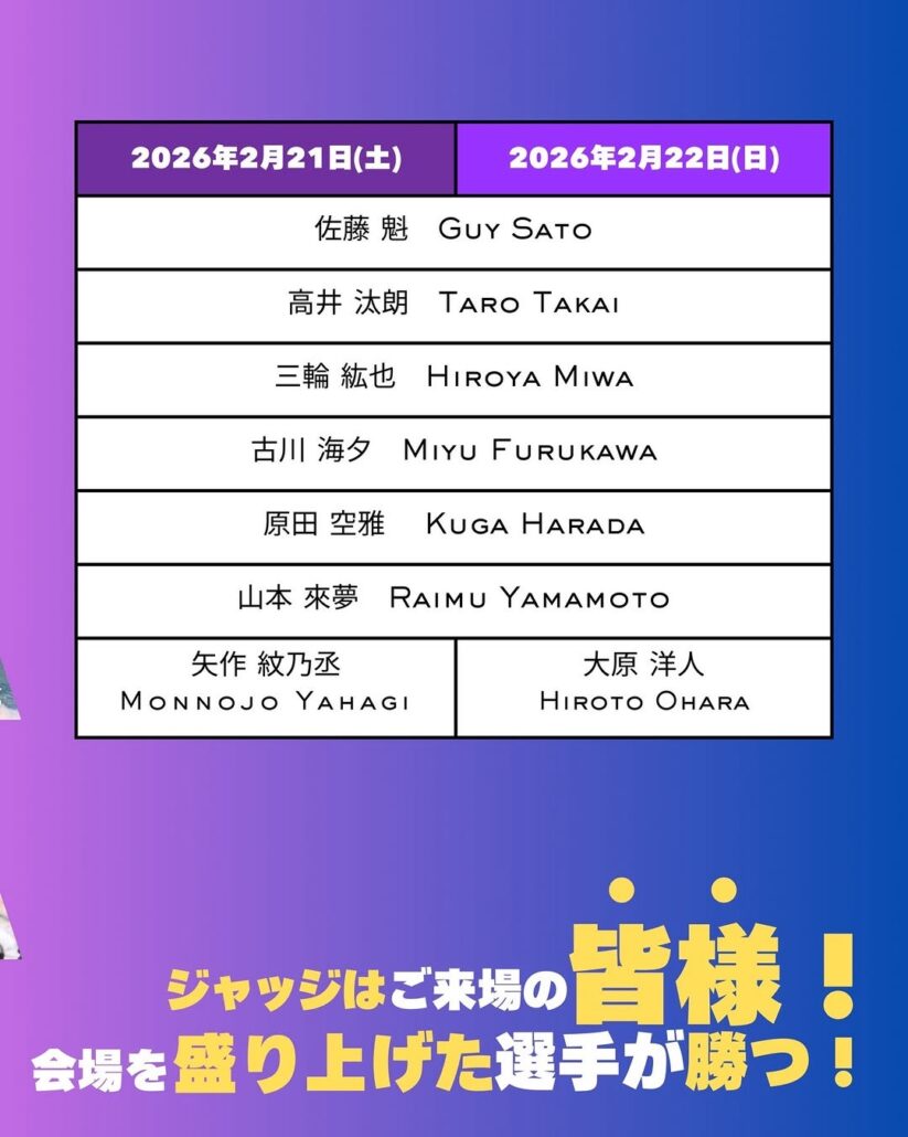 世界に認められる日本人パイプライナーとしてVANS PIPE MASTERSに招待される程の実力を持つ佐藤魁、STAB HIGH JAPANに2年連続招待選手として参加の三輪紘也、千葉が生んだサーフスター古川海夕、地元静岡のアーティスト・エアリスト原田空雅、伊豆出身の山本來夢、注目のヤングガン高井汰朗に加え、DAY2には日本が世界に誇るサーフスター大原洋人も参戦するなど、超豪華メンバーたちが繰り広げる壮絶なエアバトルをお見逃しなく!!