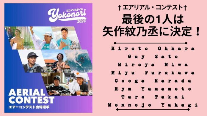 その中でスペシャル・イベントとして予定されているエアリアル・コンテストに湘南出身のフォトジェニックなエアリスト矢作紋乃丞が最後の1人となる招待選手として参戦することが決定!