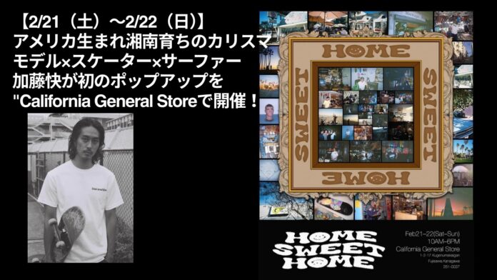 来たる2/21(土)から2/22(日)の2日間に渡り、雑誌やWeb、広告を中心にモデルとして幅広く活躍するアメリカ生まれ湘南育ちの次世代カリスマ・スケーター×サーファー加藤快が自身初となるポップアップを”California General Storeで開催することが決定!