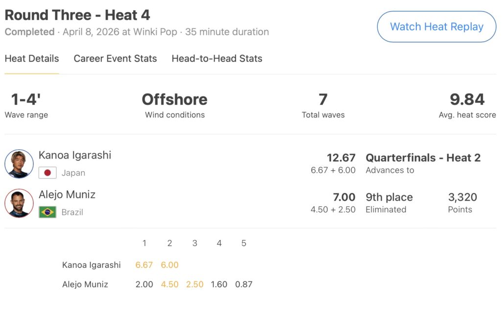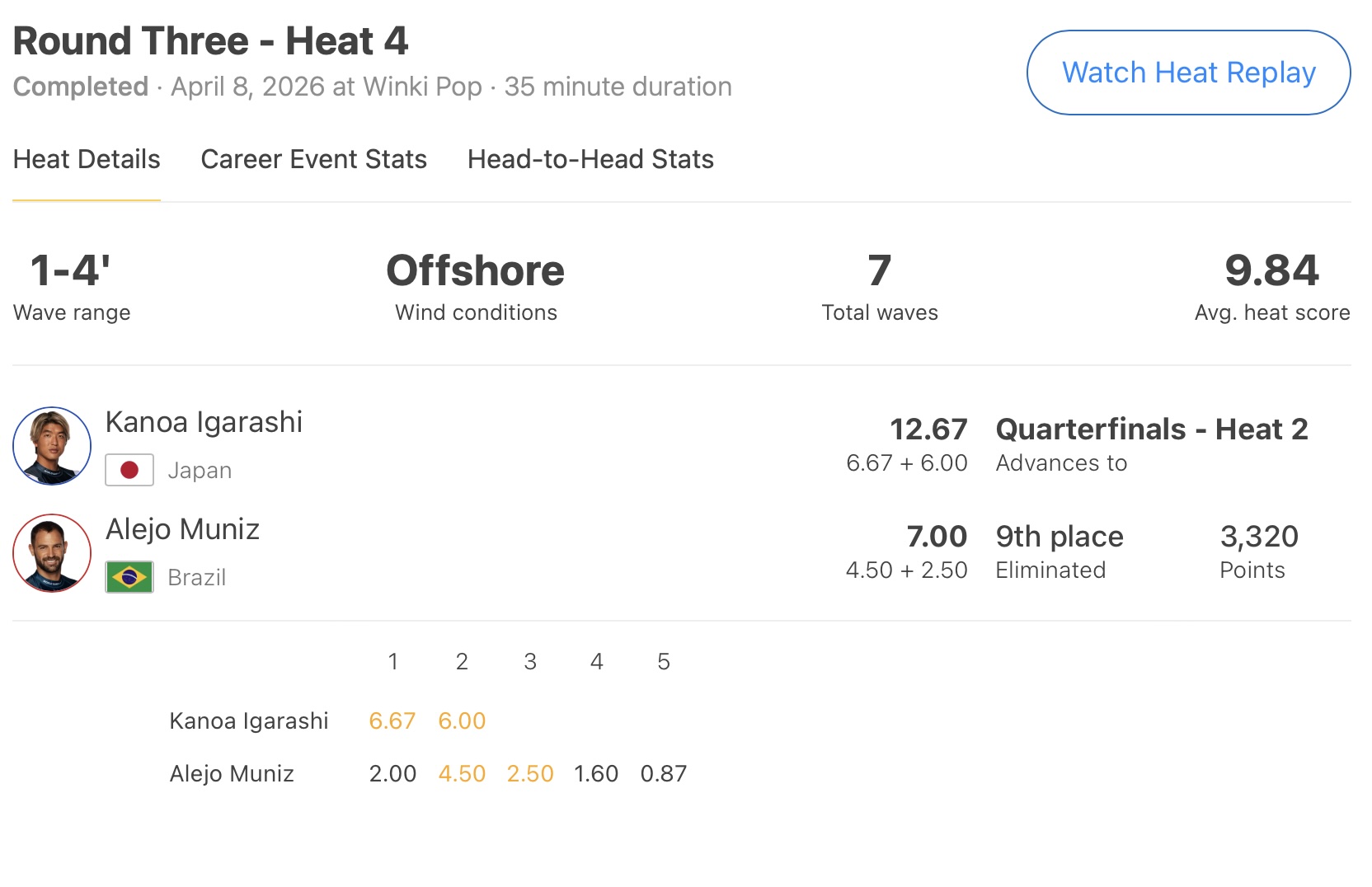 オープニング・ウェイブから6.67pt、バックアップに6.00ptをまとめ、Alejo Munizを抑えて見事クォーターファイナル進出を決めた!