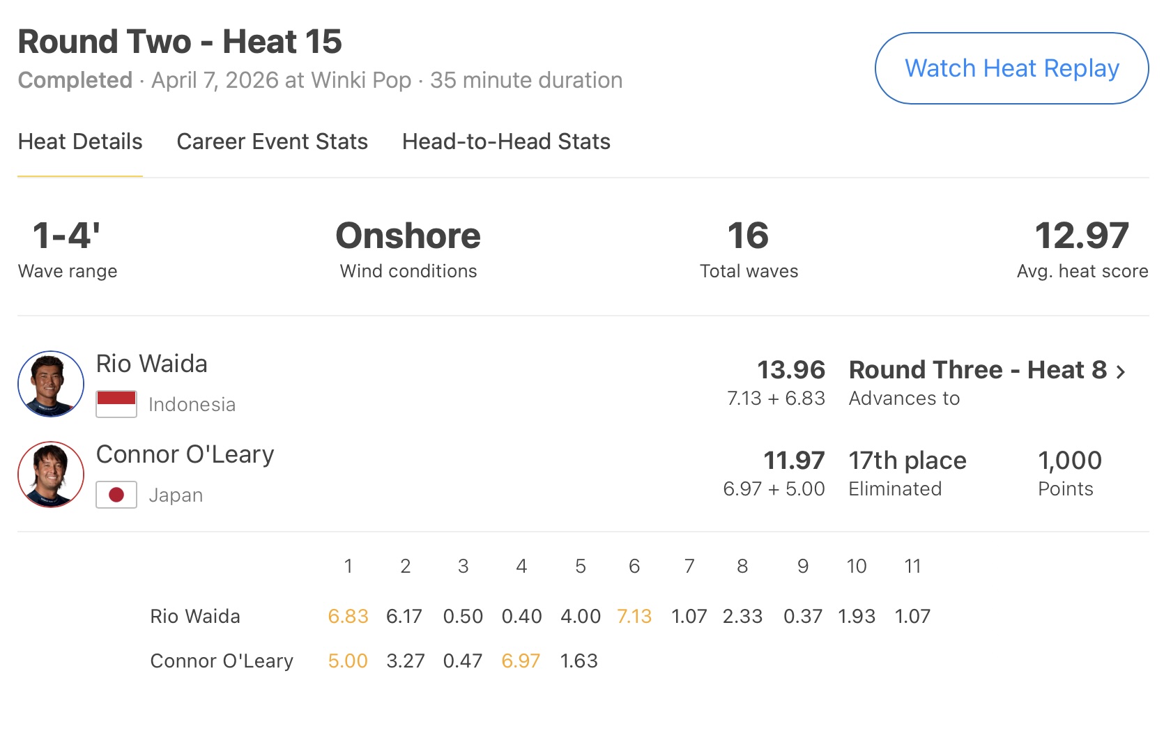 その一方でもう1人の日本代表選手であるConnor O’Learyは、この日の前日となるコンテストDAY4に行われたラウンド2のヒート15でインドネシア代表の和井田理央と対戦し、惜しくもここで敗退。