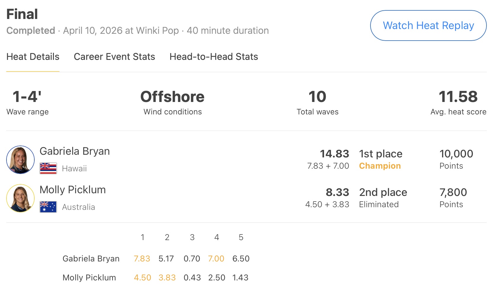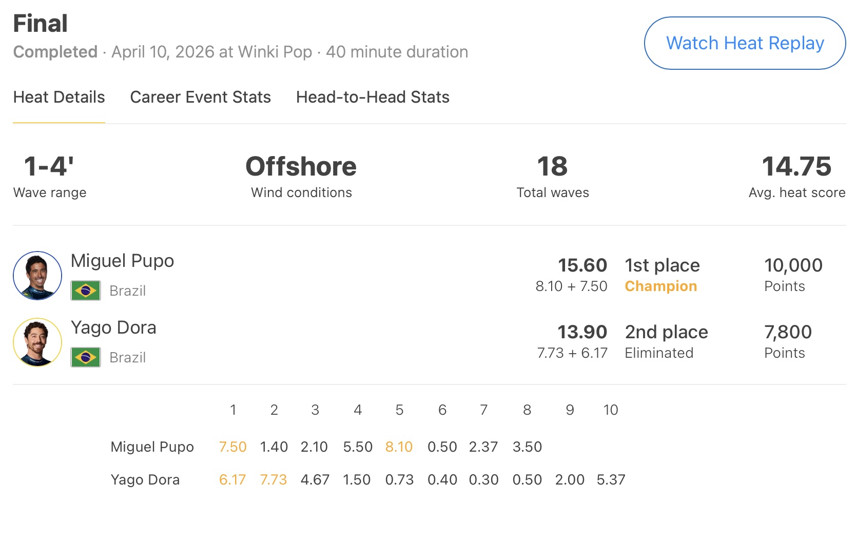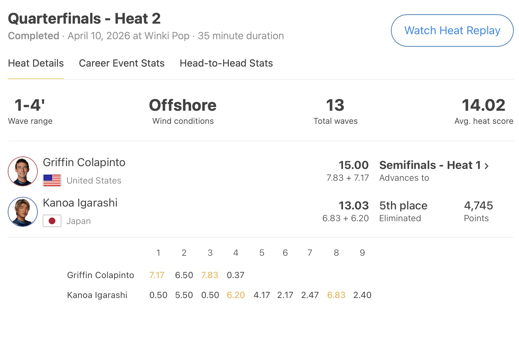 リズミカルにセットの波を掴んでヒート前半にトータルスコア15.00ptをまとめ上げたGriffin Colapintoに対し、プライオリティーを持って掴んだセットの波でテイクオフ・ポジションが深過ぎてしまったりと、海とのリズムを合わせることができなかった五十嵐カノア。