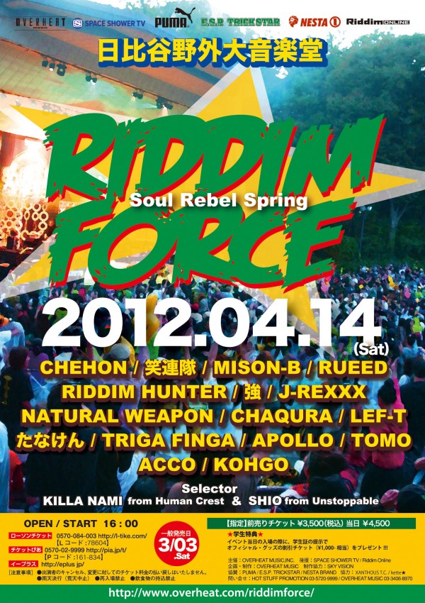 4月14日(土)NESTA BRAND 協賛 RIDDIM FORCE -Soul Rebel Spring- @ 日比谷野外大音楽堂 で開催!