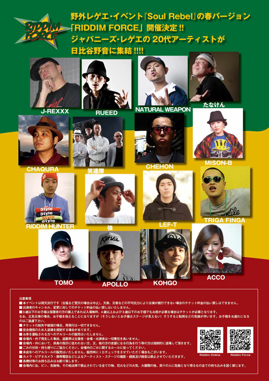 野外レゲエ・イベント『Soul Rebel』の春バージョン「RIDDIM FORCE」開催決定!!! ジャパニーズ・レゲエの20代アーティストが日比谷野音に集結!!!!