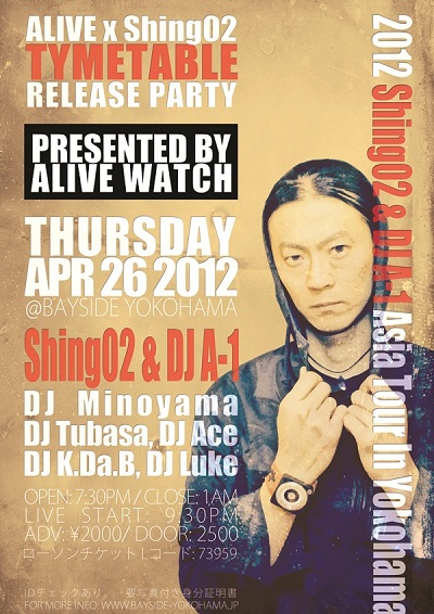 4.26 // SHINGO2 + DJ A-1 // 横浜 Bayside LIVE presented by ALIVE: TYMETABLE Release Party! By - 2012年4月19日 colorsMUSIC / tsucchy ALIVEとShing02のコラボレーションウォッチ”TYMETABLE”の発売を記念して、、 2012 Shingo2 & DJ A-1 Asia Tour In Yokohama!!! ↑↑↑Now Playing: Shingo2 – 400[甦] megamix by DJ A-1 ≫>> ALIVE