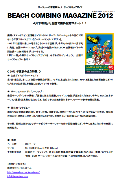 ホーム ムーブメント サーフィン-ムーブメント 4月下旬潮見表&ポイントガイド付きフリーペーパー“BEACH COMBING MAGAZINE”2012年度版、全国配布開始! ムーブメントサーフィン-ムーブメント 4月下旬潮見表&ポイントガイド付きフリーペーパー“BEACH COMBING MAGAZINE”2012年度版、全国配布開始! By yoge - 2012年4月22日 波情報のBCMが毎年発刊している 潮見表&全国ポイントガイド付きフリーペーパー “Beach Combing Magazine”の2012年度版が 4月下旬に全国配布開始! 今年は食・宿・癒のカテゴリーの充実化に加え サーフポイントマップもパワーアップ!! 今年も絶対に車の中に置いておきたいこの一冊、 詳細はしたに掲載した資料をチェック!!